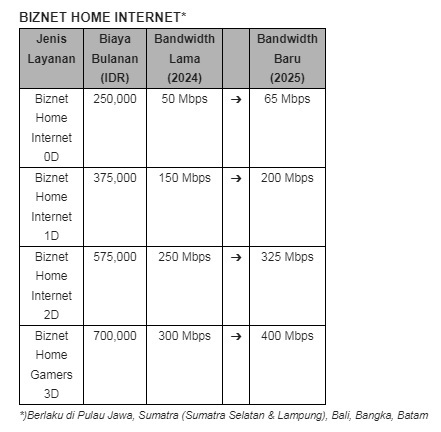 Bersamaan dengan campaign ini, mulai bulan Februari 2025 Biznet melalui produk Biznet Home meningkatkan kapasitas bandwidth lebih besar 30%, menjadikan Internet juga lebih cepat. Berikut ini detail paket layanan terbaru dari Biznet Home: