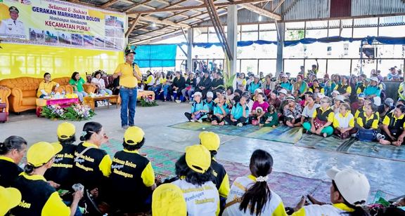 RADARMEDAN.COM,SIMALUNGUN - Bupati Simalungun Radiapoh Hasiholan Sinaga bersama ketua TP PKK Ny Ratnawati Sidabutar mengikuti Gerakan Marharoan Bolon yang berlangsung di Kecamatan Purba, Simalungun, Sumut, Senin (5/8/2024).