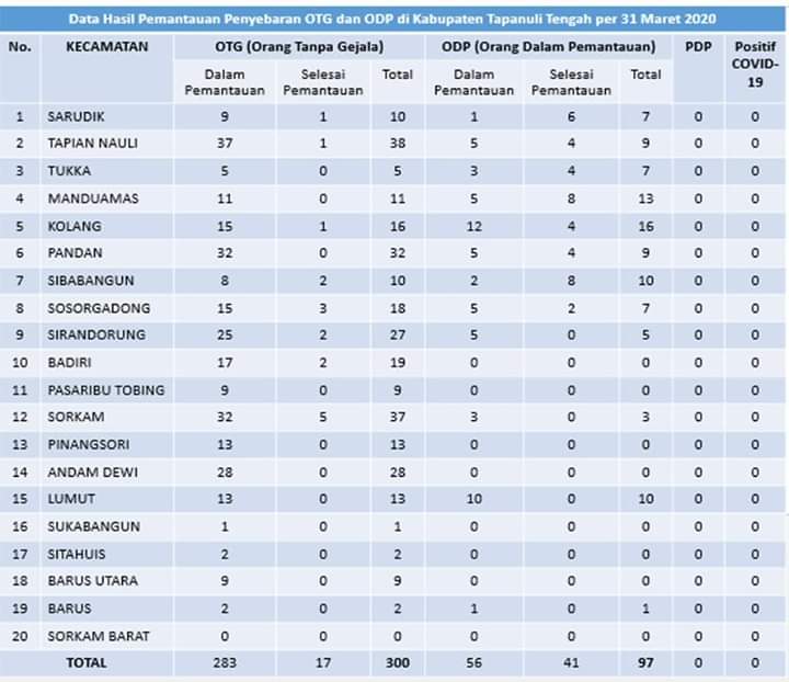 RADARMEDAN.COM, TAPTENG - Satuan Gugus Tugas Percepatan Penanggulangan Keadaan Tertentu Bencana Wabah Penyakit Akibat Virus Corona (COVID-19) Pemerintah Kabupaten Tapanuli Tengah mengupdate data terbaru terkait OPD dan OTG.