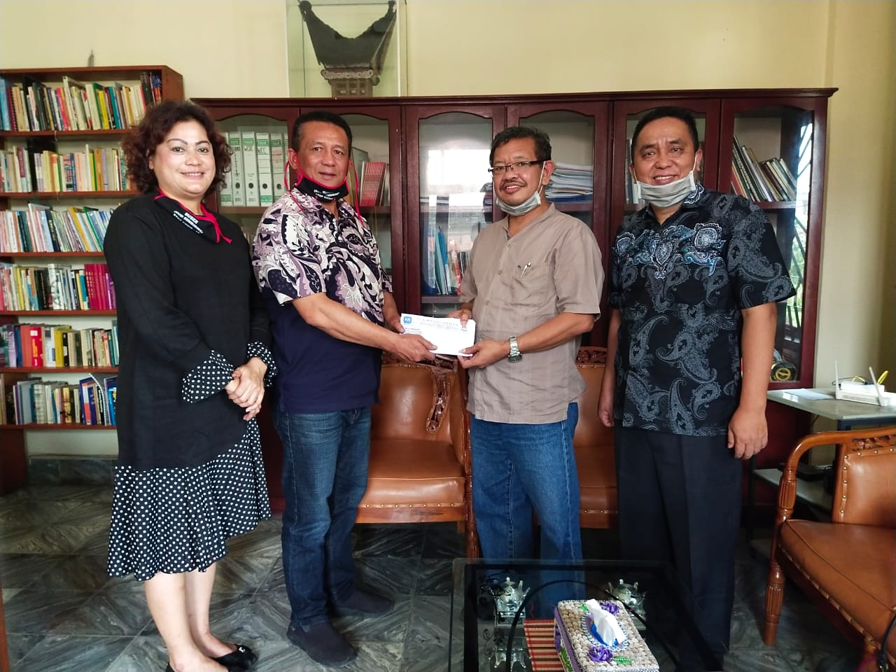 Keterangan Gambar : Thomas Ginting didampingi Istri saat menyerahkan bantuan yang diterima ketua Moderamen GBKP Pdt.Agustinus Purba,S th. M.A dan Pdt.Yunus Bangun