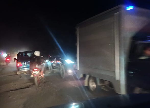 "Tidak jauh dari perbatasan Dairi ke Karo, ada truk rusak, sehingga jalan yang bisa dipergunakan hanya satu arah, dan kenderaan terpaksa bergantian lewat, apalagi truk besar, jalan yang lumayan sempit ini akan memperparah situasi, terpaksa super lambat," papar Joni.