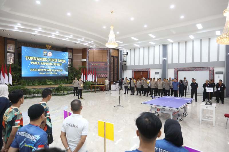 Keterangan Gambar : Kapolda Sumut Irjen Pol. Agung Setya Imam Effendi, S.H., S.I.K., M.Si. dengan penuh kebanggaan membuka Turnamen Tenis Meja Piala Kapolda Sumut dalam rangka merayakan Hari Bhayangkara ke-78, Kamis, 20/6 di Aula Tribrata
