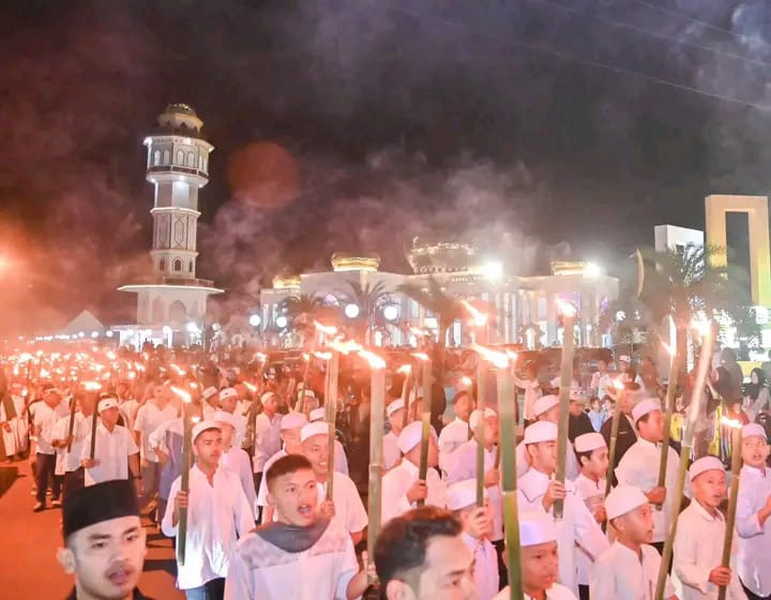 RADARMEDAM.COM, PADANGSIDIMPUAN - Pj. Wali Kota Padangsidimpuan, H. Timur Tumanggor, S.Sos, M.AP, bersama Forum Komunikasi Pimpinan Daerah (Forkopimda) melepas secara resmi Pawai Obor dalam rangka memeriahkan Hari Santri Nasional 2024. di halaman Masjid Agung Al-Abror Padangsidimpuan. Selasa (22/10/24).