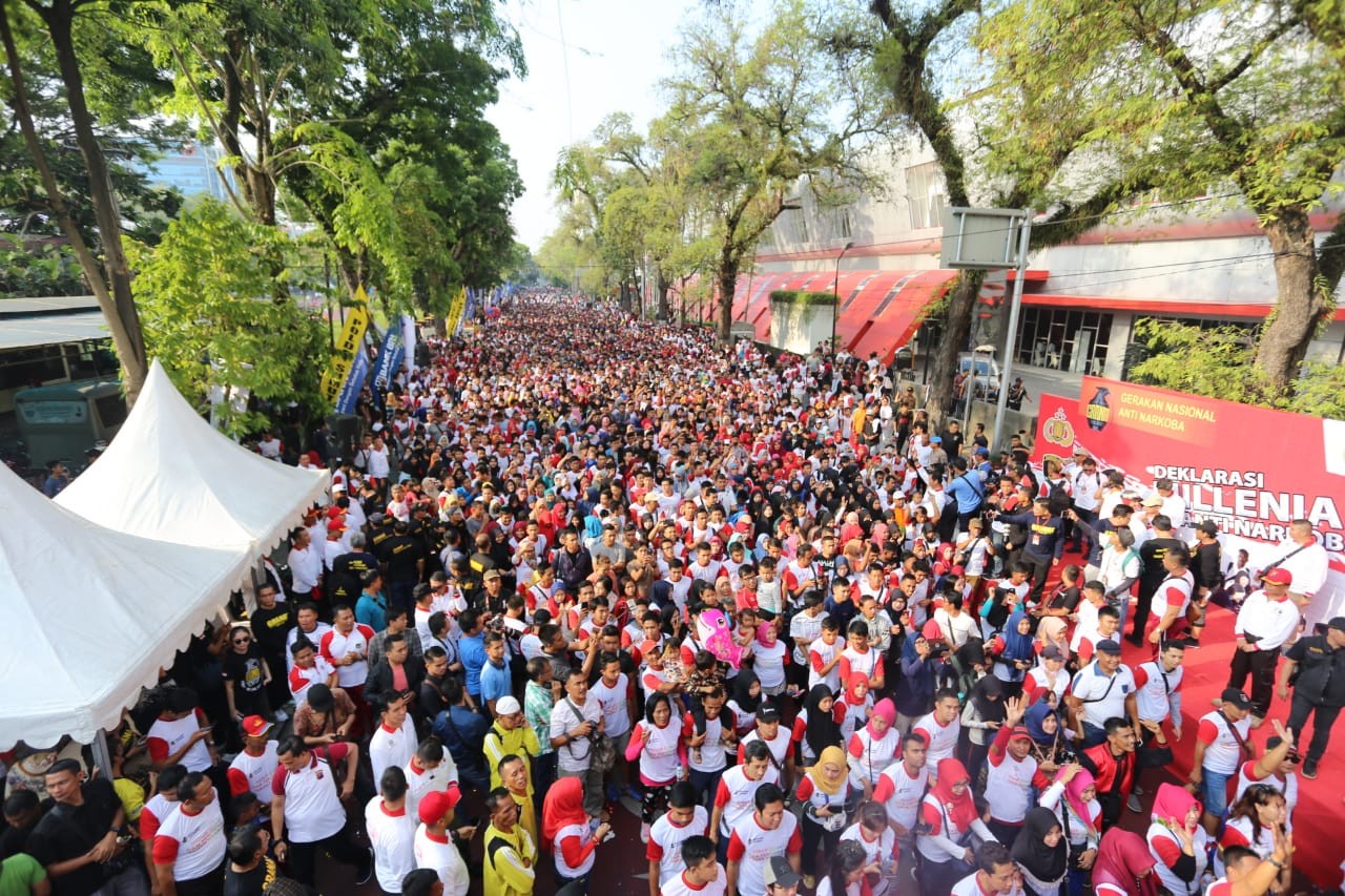 RADARMEDAN.COM - Puluhan ribu kaum milenial mengikuti “deklarasi milenial anti narkoba sekaligus jalan santai, di lapangan Benteng Medan, Minggu (24/3) pagi. Kegiatan tersebut digagas Gerakan Anti Narkotika (Granat) bersama Kepolisian daerah Sumatera Utara.