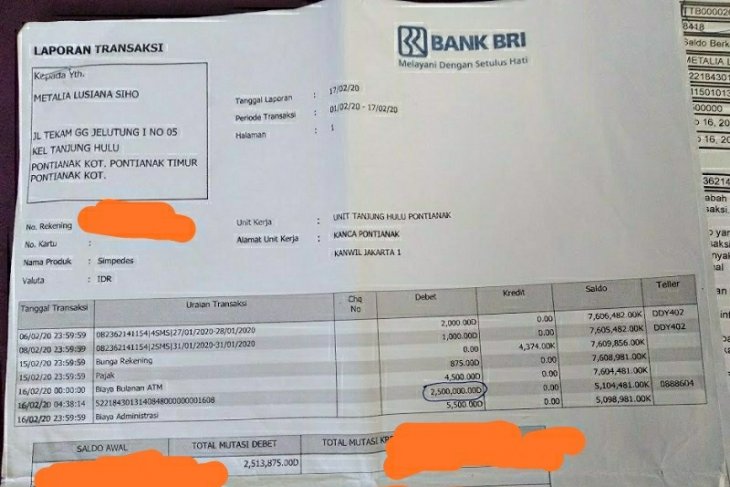Dijelaskannya, ia membuka rekening di kantor unit BRI Tanjung Hulu Pontianak, Kalimantan Barat, karena mereka tinggal di sana. Dan sejak bulan Januari 2020, Ia berangkat ke Medan ke tempat saudaranya. Saat itulah Ia mendapat SMS lewat nomor ponselnya bahwa ada laporan transaksi sebesar Rp2,5 juta, padahal dia tidak ada melakukan transaksi apapun pada tanggal itu.